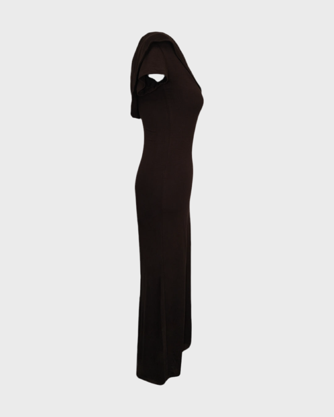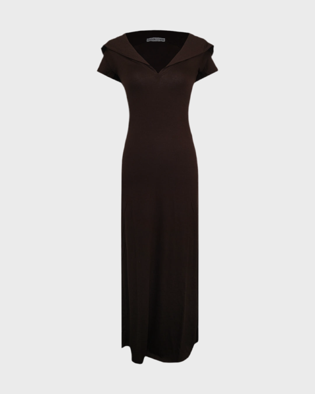 Long, fitted dress in soft, stretchy fabric with a deep V-neckline and a wide hood at the back. Designed to gently contour the body while offering a relaxed yet sophisticated silhouette.