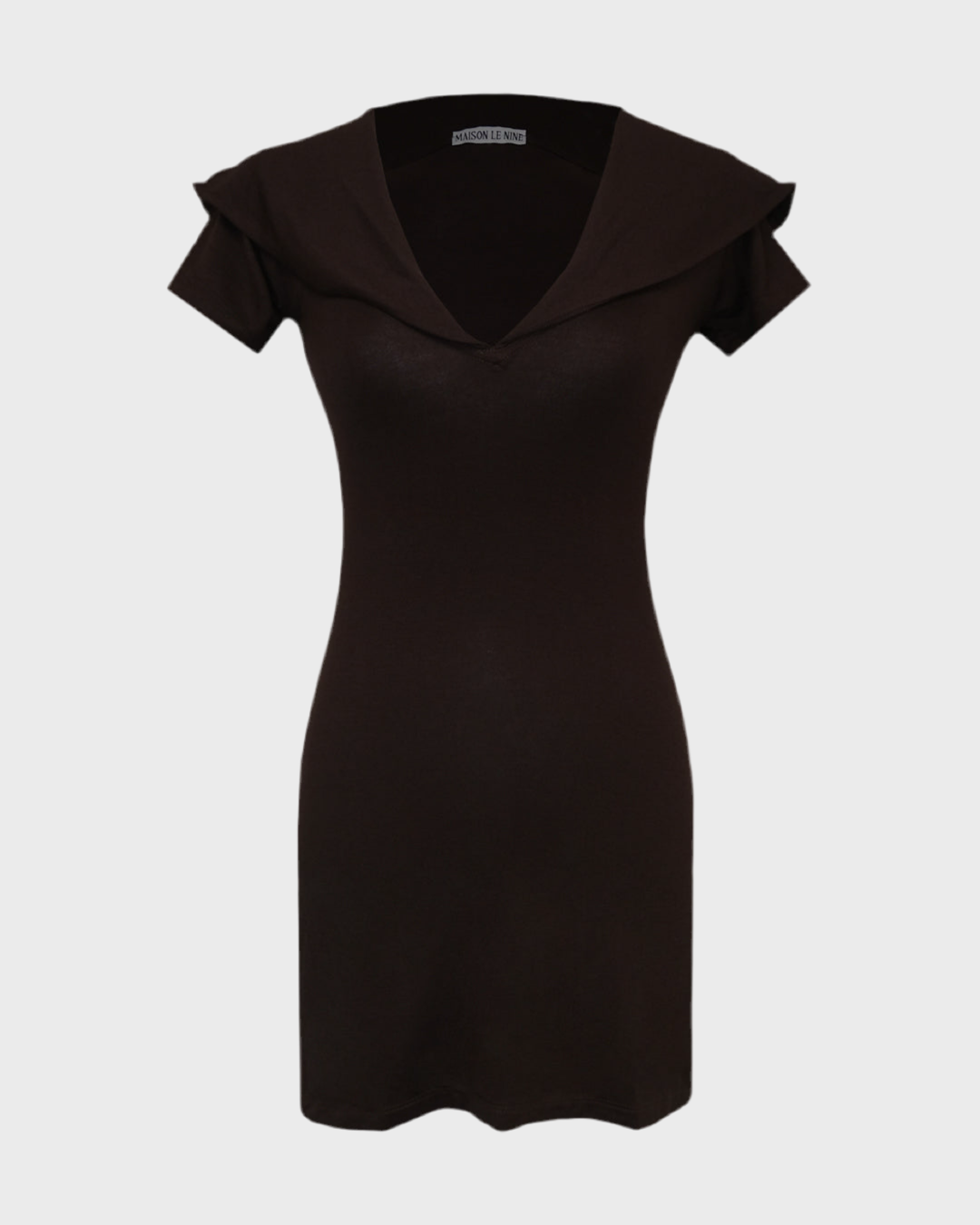 Short dress in soft, stretchy fabric, featuring a deep V-neckline and an oversized hood at the back for a unique, modern twist.