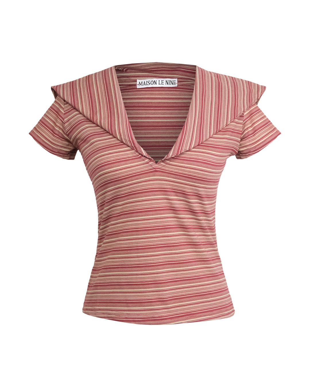 Short-sleeve top in soft, stretchy fabric, featuring a deep V-neckline and an oversized hood at the back for a unique, modern twist.