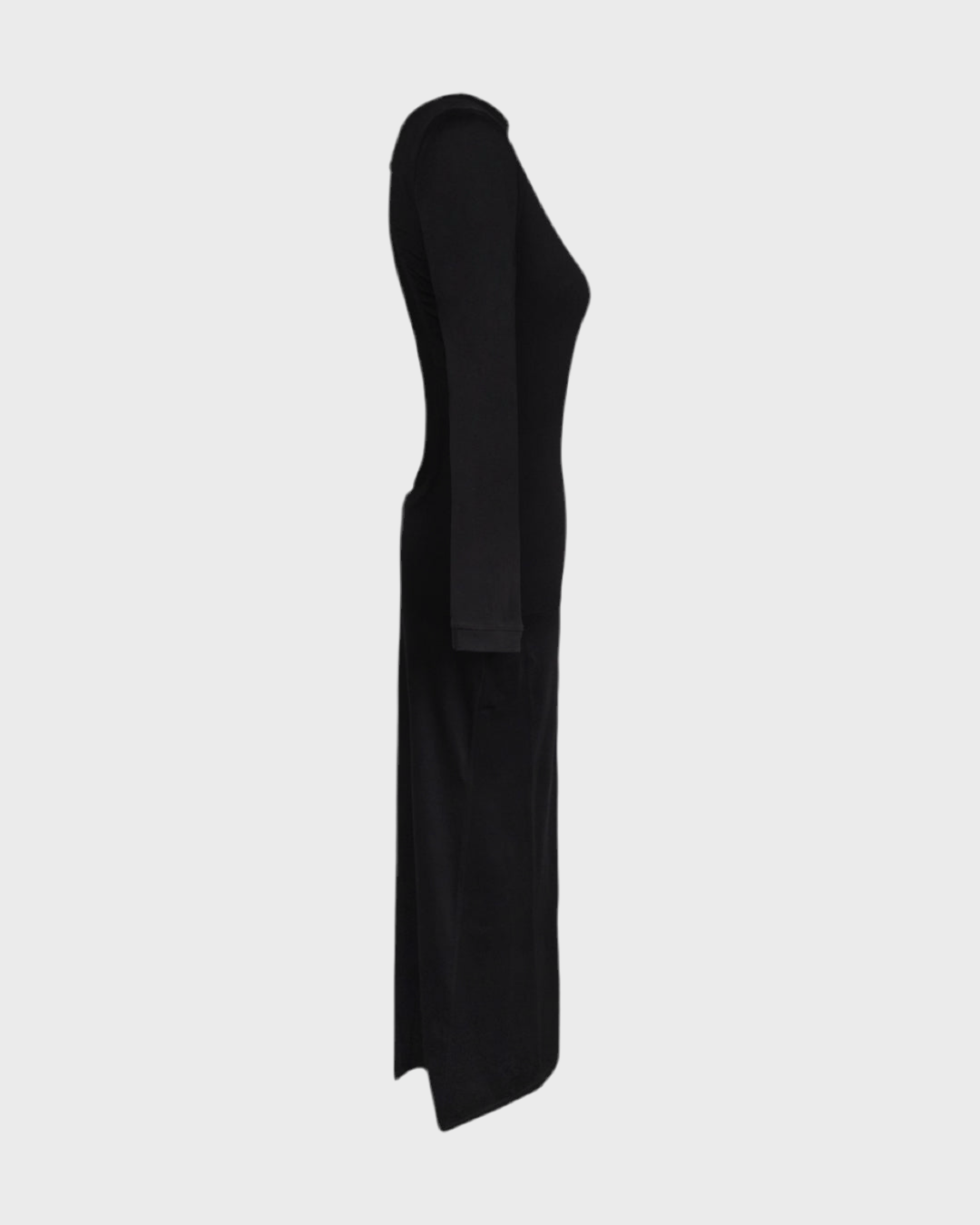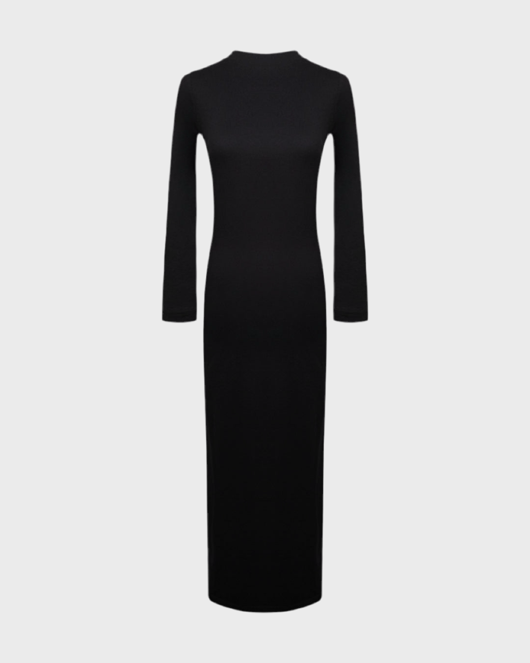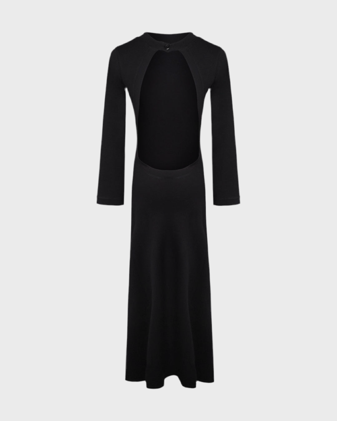 Black long-sleeve long dress featuring an open-back design with a button closure at the neck. Made from stretchy fabric that hugs the body for a flattering fit.
