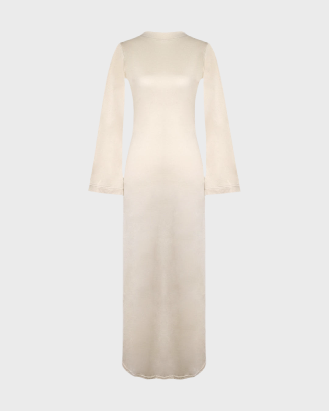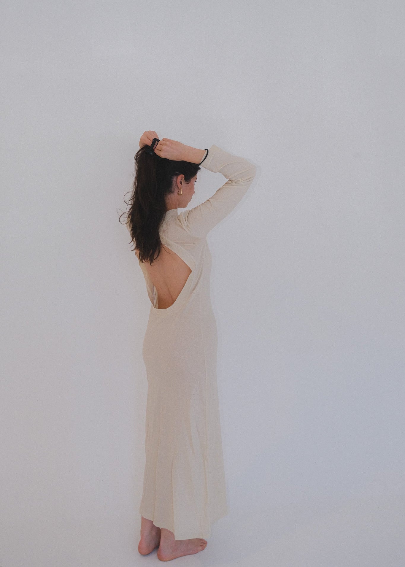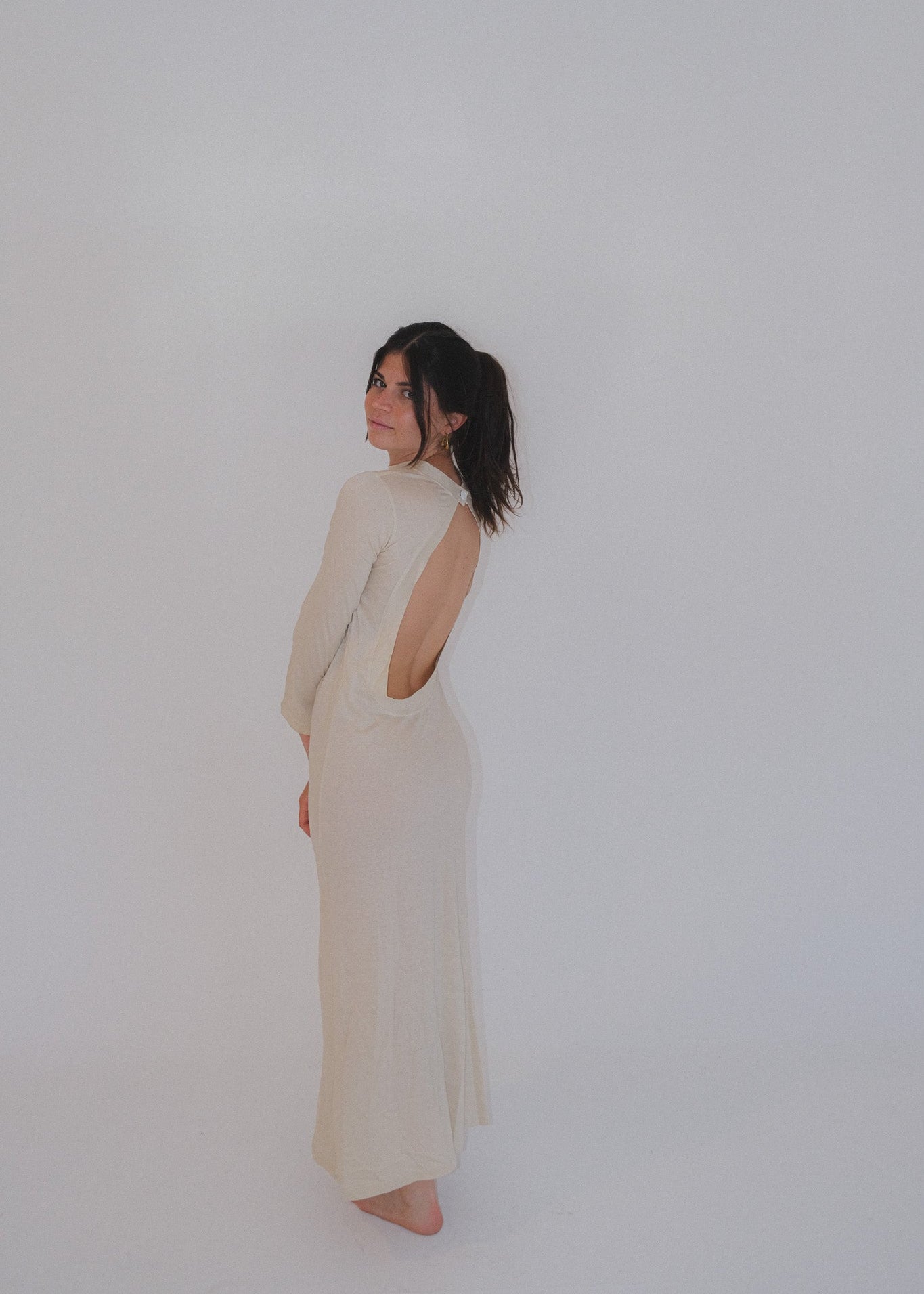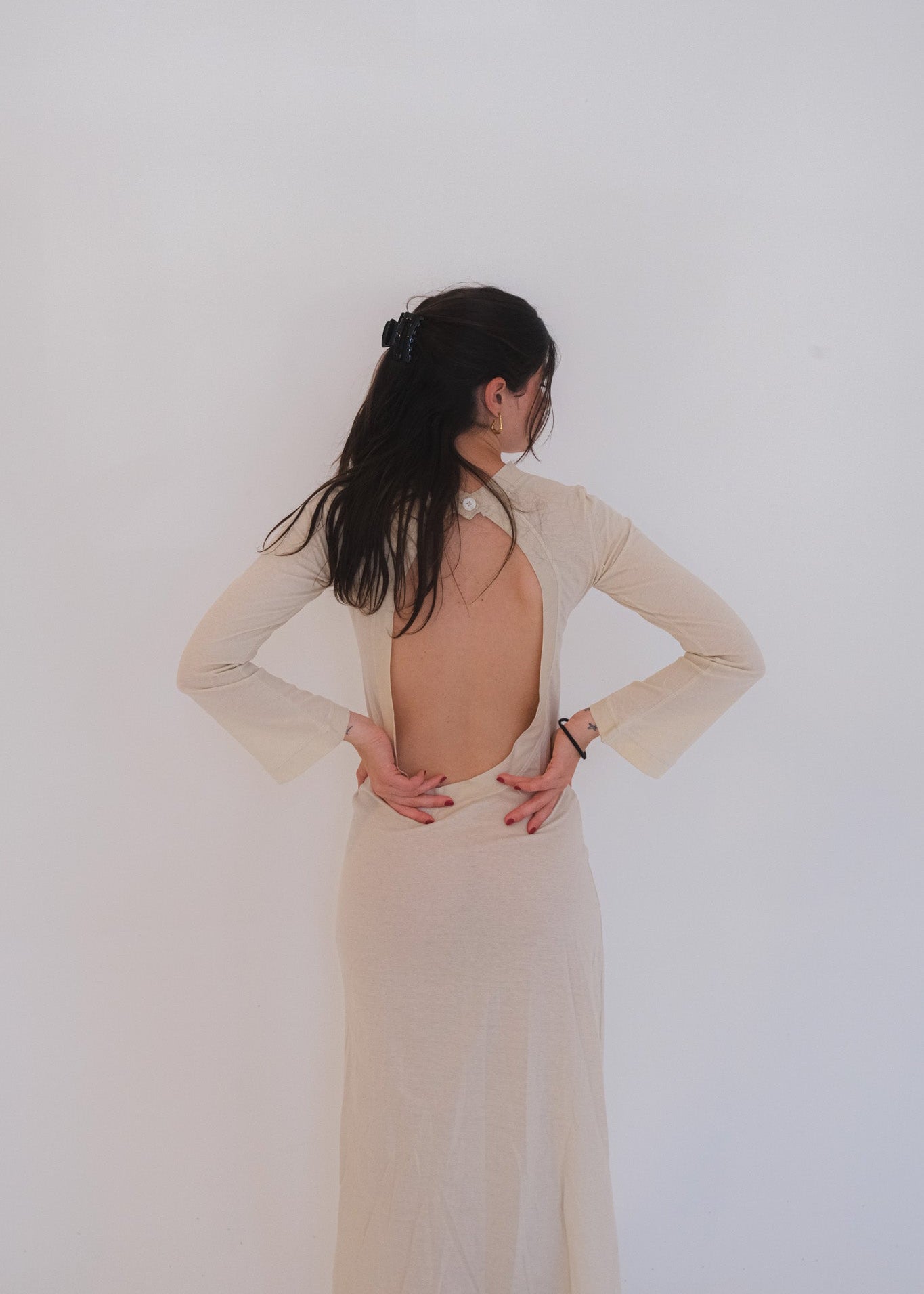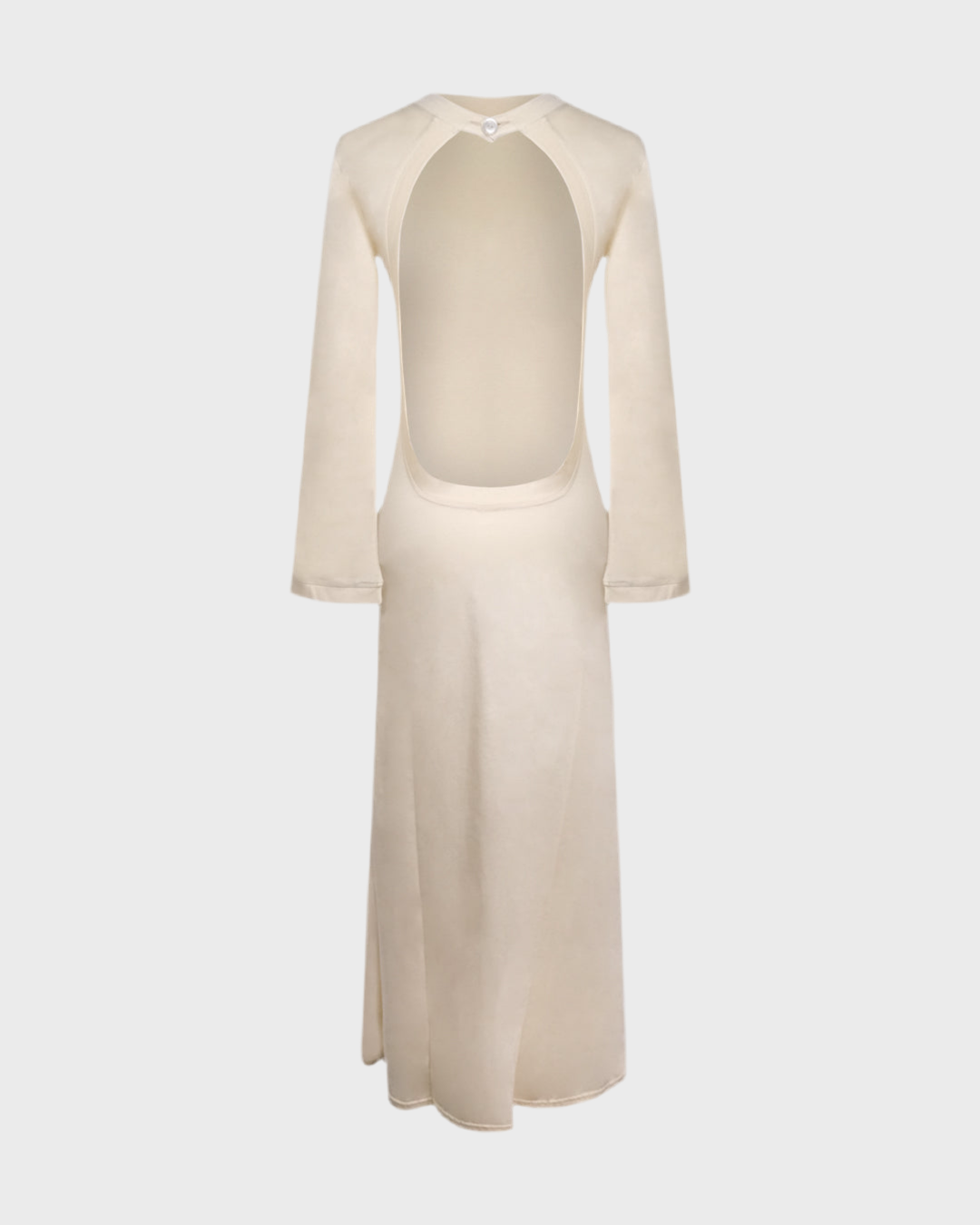 Black long-sleeve long dress featuring an open-back design with a button closure at the neck. Made from stretchy fabric that hugs the body for a flattering fit.