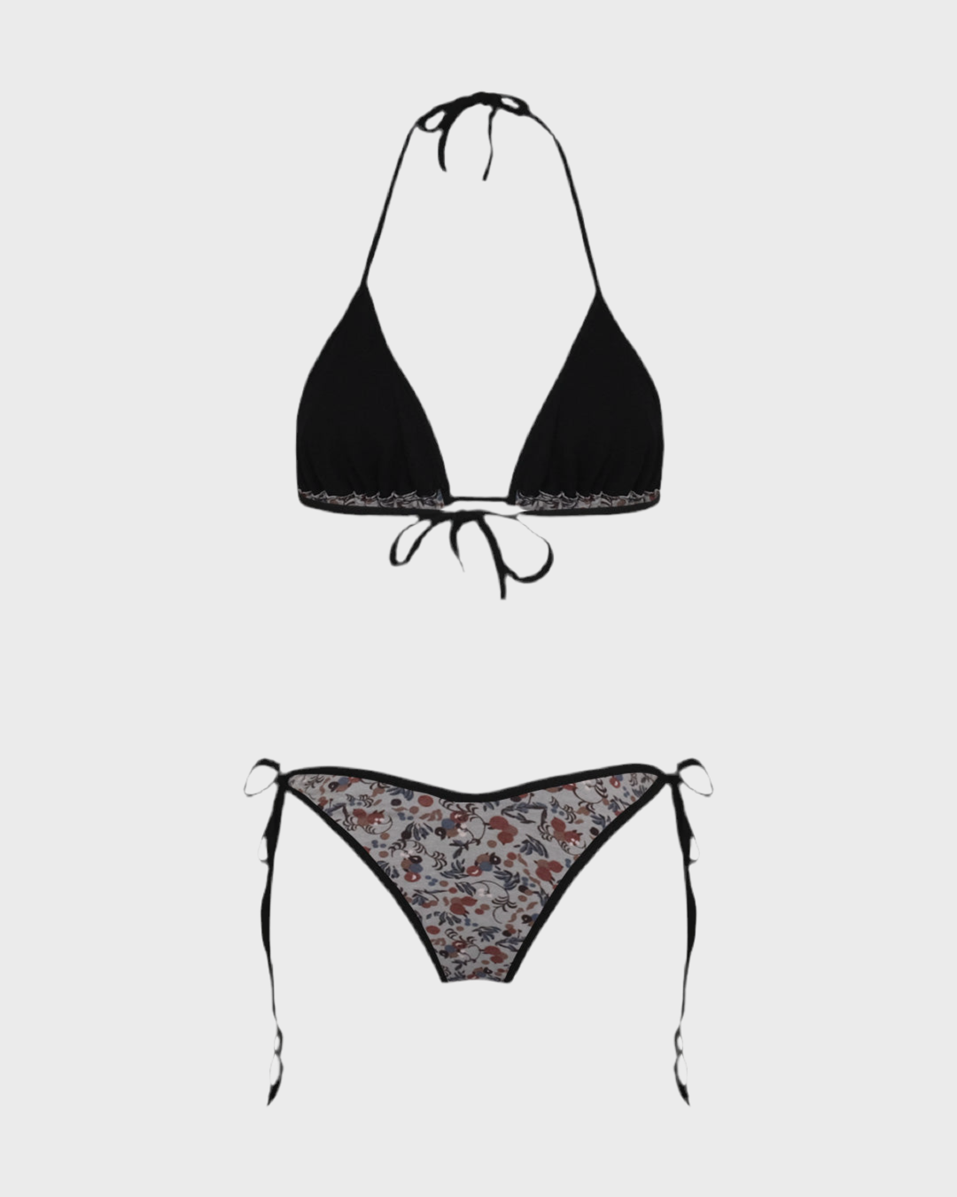 This two-piece bikini features a V-cut bottom designed to enhance and elongate the silhouette. A statement piece with artisanal roots, 100% handcrafted.