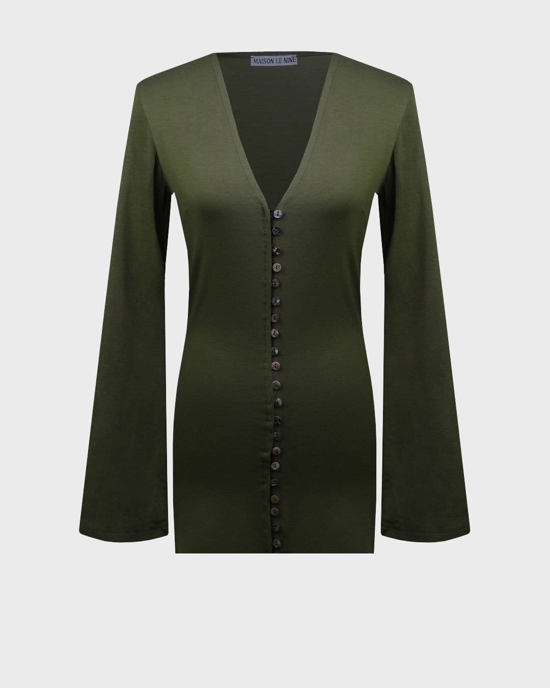 The mini dress features a deep V-neck and opens with buttons, the dress follows the body shapes and the sleeves are soft and slightly flared at the hem
